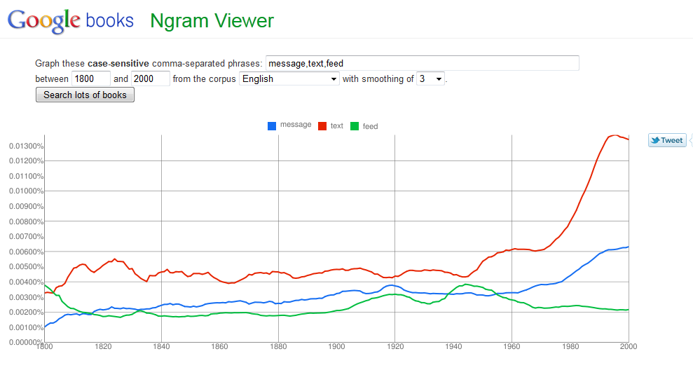 I tried the viewer first with common English words that I knew have additional meaning in the last few decades: text, message, and feed. Click on the first image to see the results. My second test used God, Jesus, and Bible. Again, click or right-click on the second image to see the results.