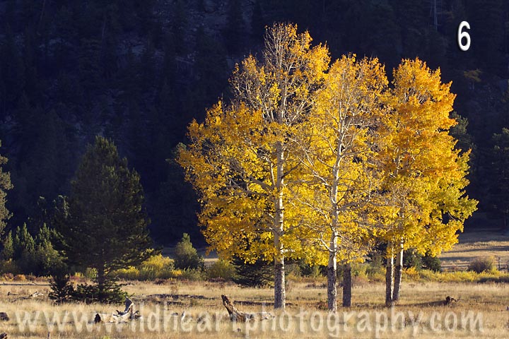 Get up early and stay out late. The best lighting comes within an hour or two of sunset and sunrise. Be there at least a half an hour before sunrise and 20 minutes after sunset before putting the camera away. Image 6 was taken in early morning late which lights the Aspen Trees in Horseshoe Park while leaving shadows in the background.