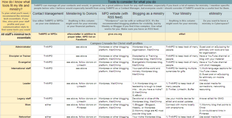 For today, I composed a chart in Google Drive that could help you think through what might be some good goals for this year. For those who want to do more than the minimal MPD essentials and are considering, for instance, an MPD website or starting some type of eMinistry, I hope this chart helps you. The ideas aren’t exhaustive, but are simply meant to fuel your dreams. Find your staff profile and/or your communication style to find some tools you could consider using. As an example, you’re a discipler or trainer and prefer using your mobile phone, therefore (picking one or more), would you or your ministry benefit if you: