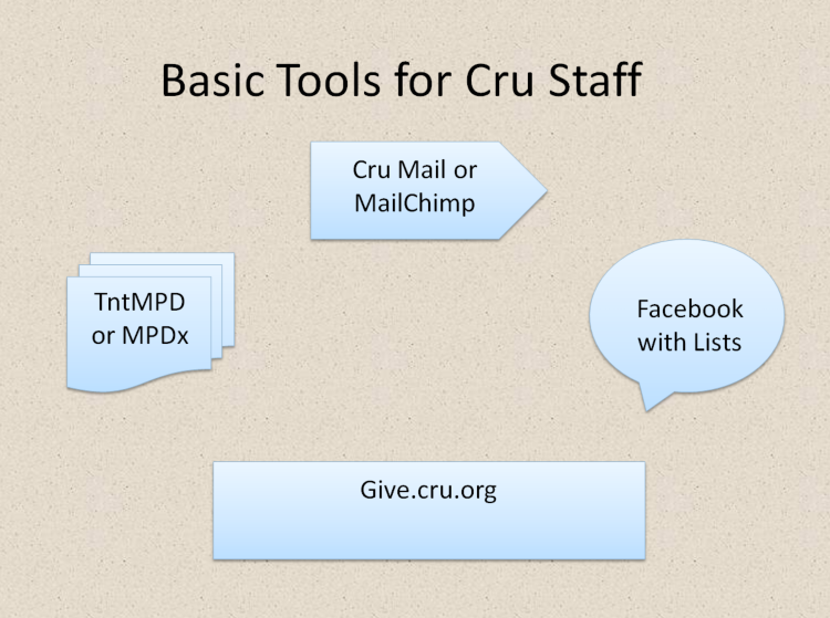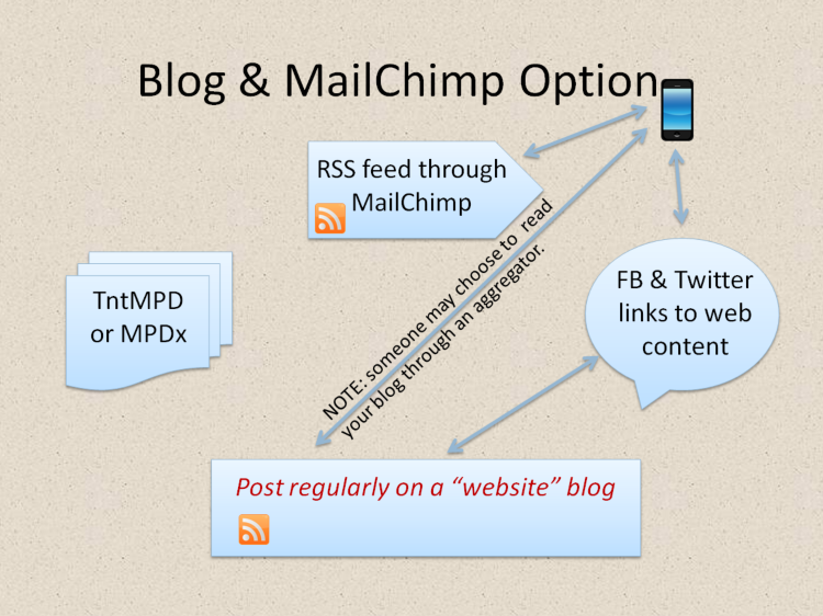 Whatever pieces are missing determine to put them in place by the end of the year through the You-Can-Too series. We’ll also be connecting these building blocks together. They’re more effective as you sync them. A regular email newsletter The first thing I’d like you to think about is doing a regular email newsletter. This would be in-between your paper newsletters or maybe sent quarterly if you want to do it that way. It’s a nice-looking supplemental letter. Maybe it has a little more family information than you have on your prayer letter. Our financial partners have loved these for more connection with us. You have the option of using MailChimp, which I recommend, but I realize there’s a learning curve to use it. I’ll have lots of MailChimp resources on eQuipping for eMinistry over time. The communication portion of the You-Can-Too series started with The Who and How of Writing Well. Have a central database You should choose a database. I don’t want you to fall into the trap of having names in this spot and addresses over here and emails updated over there. That’s why I recommend TntMPD or MPDx to keep names and addresses all in one place. I use TntMPD because it syncs with MailChimp and with my email information. I keep much of my email history in it. So it’s really quite an effective tool that you should be using. We’re starting February 5th with the database posts in the You-Can-Too series. Also, on February 15th, I’ll present my research so you can choose the database that will work best for you. Interact with your donors on Facebook I have one good story that I think will convince you that you need to interact with your financial partners through social media. I was checking my MPD list on Facebook one day and saw that a $25 a month donor wrote: “Please pray for us and our daughter.” I noticed that she had written this three minutes before, so I decided to phone her. It turned out that their daughter had run away! They knew where she was; she was coming back the next day. I had that opportunity to minister to our donor and to pray and be a part of that family’s concerns that weekend. That’s just one story of many that I’ve had in being connected with donors through social media. The social media series starts March 4th. GIve.cru.org Does your page on give.cru.org have a quality photo and a description of your ministry? If you haven’t done this, everyone needs to make sure this page is updated regularly. This IS your website if you have nothing else, so make sure it’s attractive and informative. It won’t take you very long. Go to How Does Your Free Webpage Look? on my blog, eQuipping for eMinistry, to find out about all the steps you need to do to have an effective give site. Make your MPD website more social We’ll start working on web sites starting March 18th. I’ll be recommending you put an MPD website together that has a blog sending a feed of your posts to your readers. Look at how this next slide shows some of the building blocks working together.