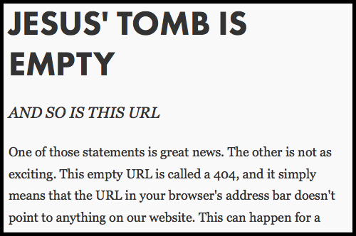 When someone requests a page that’s not on your site, they see the 404 (page not found) error page. But it doesn’t need to be a sterile “that page doesn’t exist” page — the one above is from JudyDouglass.com. I love the idea of using a custom error page to communicate the gospel!