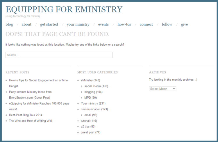 Think about ways that you can use your 404 page to educate, encourage, or entertain. Hopefully your site is organized well enough that people won’t see the page often, but they will eventually — it might as well be a positive experience! You can also provide suggestions or list the content on your site like wordpress.com does automatically. This example is eQuipping for eMinistry’s 404 page: