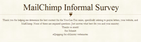 This is a bonus question. Whether or not you have any interest in emailing prayer letters or using MailChimp, I’d love it if you would answer the last question on the survey about how the You-Can-Too series has helped you. Thank you so much for reading eQuipping for eMinistry and for taking this survey!
