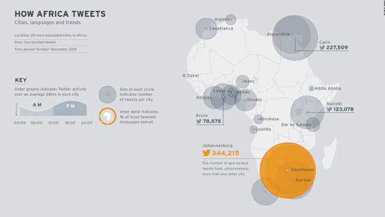 Evenings (African time) and especially Tuesdays and Fridays are the best time to tweet. English is also about 75% of the tweets in Africa, so it’s easy to connect. Arabic is the second most common language for tweets.