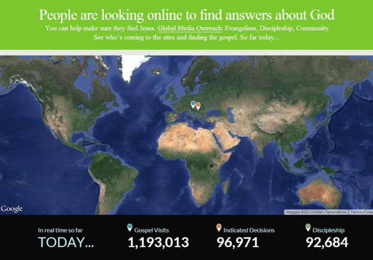 - I love the screenshot at the top of this post from Global Media Outreach, showing one person visiting an evangelistic website and another indicating a decision for Christ simultaneously. Follow the link to watch this map in real time as people search for God online!