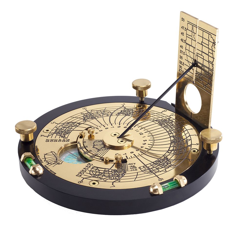 NOTE: The photo of the portable sundial is on Wikimedia Commons. The Horus sundial “corrects for latitude, time zone, daylight savings time, longitude, and equation of time; with magnetic declination correction and spirit levels. http://www.horussundials.com.” I’m impressed!