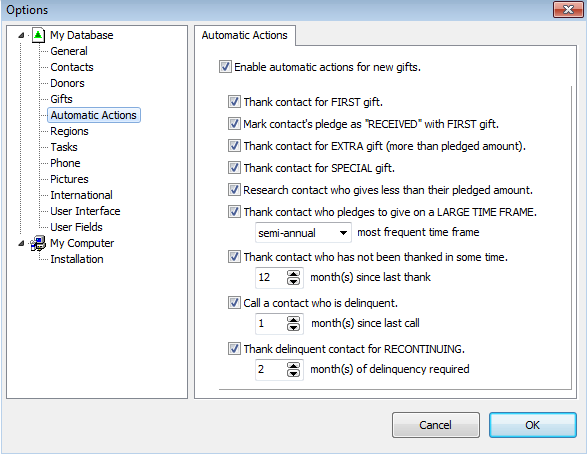 - For the remaining options I have 12 to make sure consistent donors receive an annual thank you. The next option is for phone calls. I then chose 2 for the RECONTINUING option, although, I’ve considered using 1.