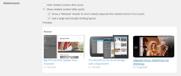 - Also, in Settings / Reading / Related Posts, check the second circle and its two squares (see the following screenshot). As you check and uncheck these, you’ll see how they look if you’d rather do this differently.