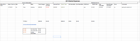 Again, you would consider whether to have separate spreadsheets per year or per reimbursement. I think I would keep a year’s spreadsheet. It’s fairly easy to hide all the rows (and some columns, too) not pertinent to a particular reimbursement. First, sort on “Date Submitted” and then on “Date of Service.” Then, hide the rows outside of the “Date Submitted” that you’re interested in and print a copy of your spreadsheet(with just this data) to clip to the paper reimbursement until you’re ready to turn it in. In this way, a year’s reimbursements is in one document. If that really doesn’t matter and a separate spreadsheet per each reimbursement works better for you, then that’s the way to go.