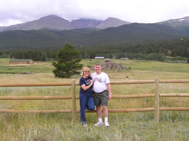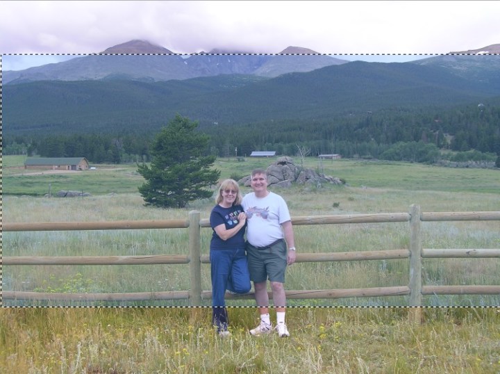 For this post, I’ve chosen the image of Mike and me with Long’s Peak in the distance. It looks great at the top of this article, but I’ll use this photo for a slider image on the home page, as well. So, notice the shaded blue rectangle in the photo below where the default crop for a slider image removes our feet and the tops of the mountains.