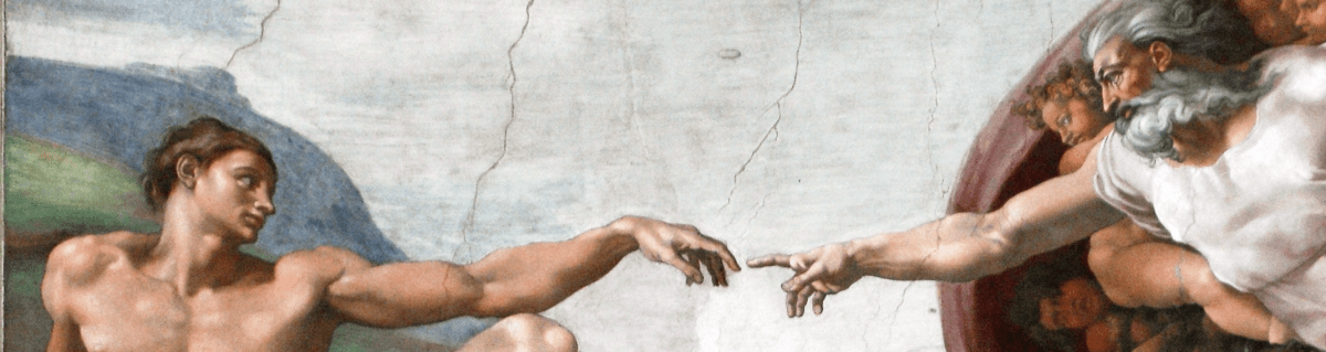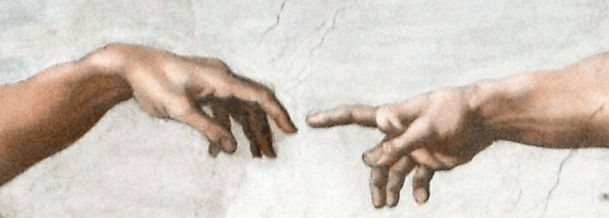 The image, The Creation of Adam by Michelangelo, is in the United States’ public domain. Many people recognize this scene from the Sistine Chapel ceiling, painted between 1508 – 1512.