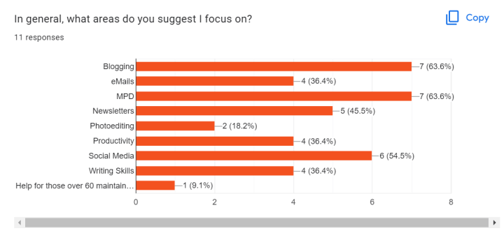 The above screenshot is from the responses I’ve received so far. Cru staff have asked for help with (in this order) blogging, MPD, social media, newsletters, emails, productivity, and writing skills.