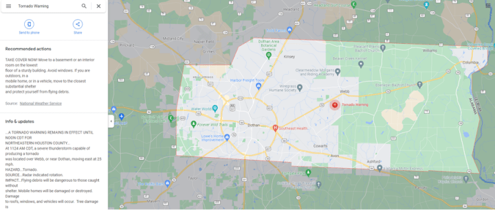 To write this post this morning, I discovered a tornado warning in Dothan, Alabama. This time, I clicked on the icon. I could see the sidebar and what area was under the tornado warning.