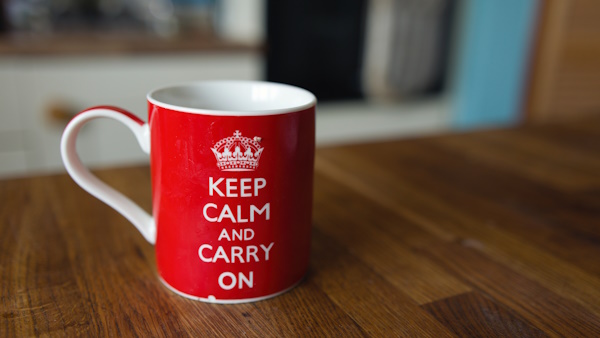 - “Keep Calm and Carry On” was a message circulated by Britain’s Ministry of Information as World War II approached. The mug displays the look of the original 1939 poster. The message was meant to raise the morale of the British people as they faced the prospect of mass air attacks on their major cities.