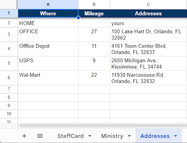 You’ll notice I have three tabs across the bottom. These are separate pages for StaffCard expenses, ministry expenses, and addresses.