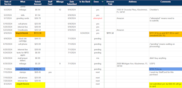 I’ve made a ministry-only spreadsheet and hope this post is easier for you to get started with a reimbursement spreadsheet. (My previous posts explained medical reimbursements at the same time.)