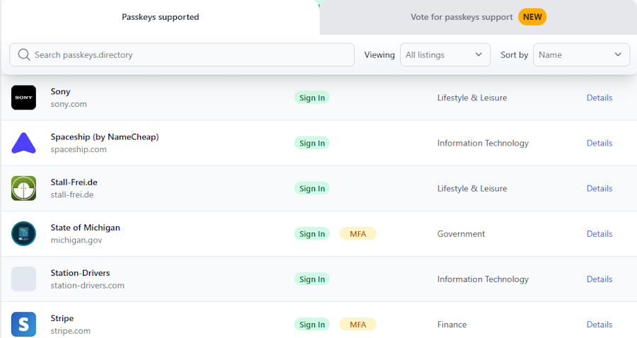 If you want to try passkeys, this Passkeys.Directory lists websites and apps that use them. Here’s a screenshot: